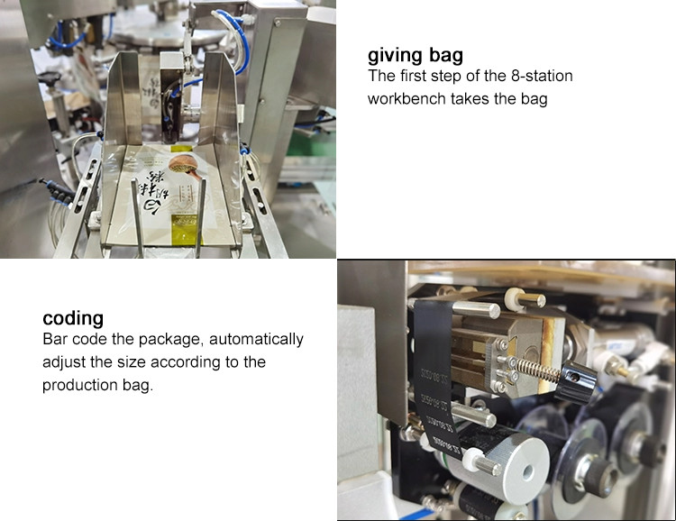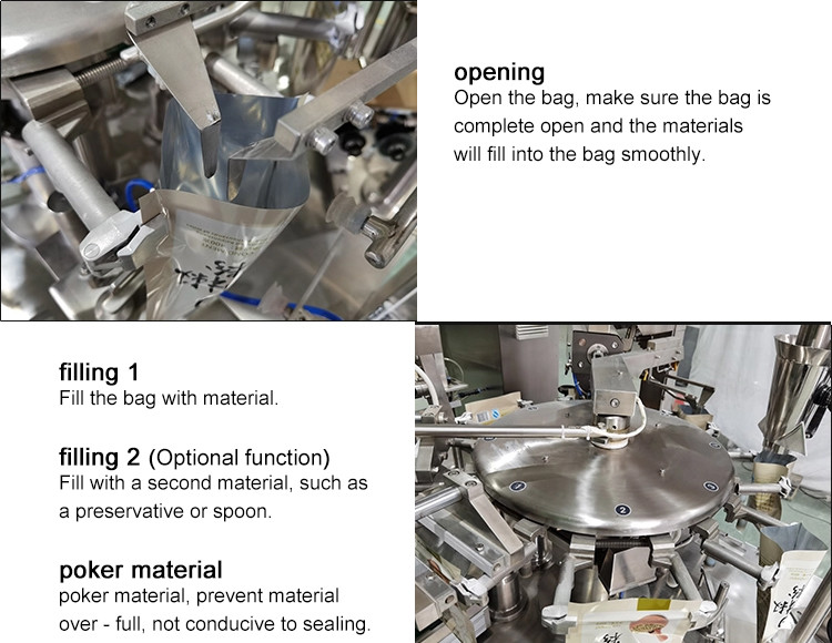 | कार्यप्रवाह | देने वाला बैग→कोडिंग→ओपनिंग बैग ((या ओपन ज़िपर बैग)→भरण→सहायक→निकास→हीट सीलिंग→प्रोडक्ट्स बनाने और आउटपुट करना। | ||